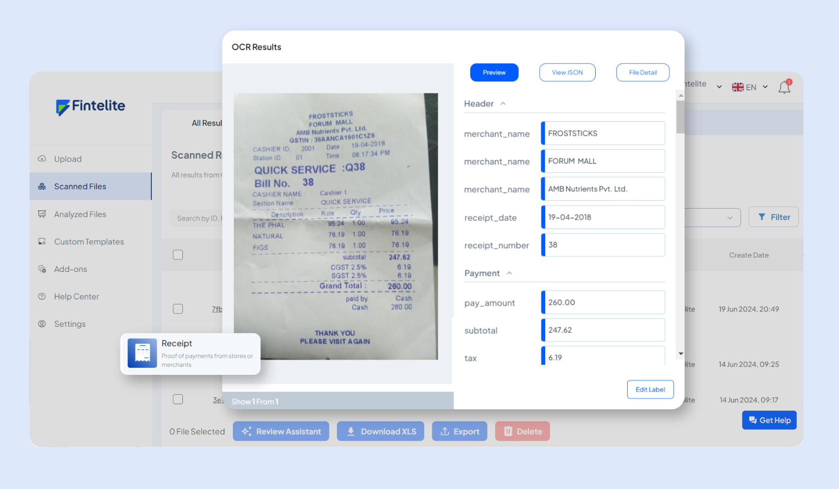 Say goodbye to time-consuming manual data entry and embrace the power of AI-powered OCR to automate receipt data extraction. OCR automation frees you from tedious, repetitive tasks, allowing you to maximize time for what matters most. Convert the unstructured data from your scanned receipts into readily processable assets for expense analysis. Fintelite AI-powered OCR is packed with cutting-edge features that simplify data extraction and streamline data delivery to your accounting platform.