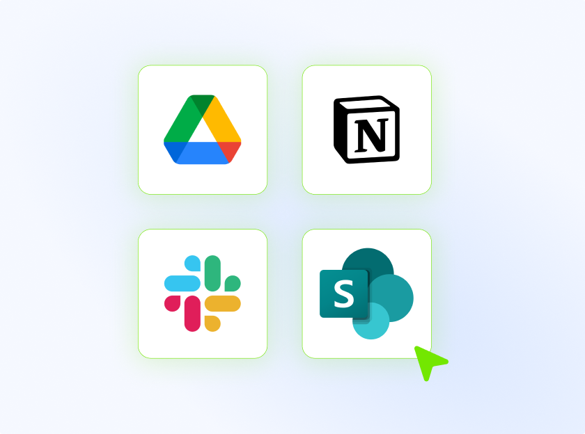 Easily sync knowledge from Google Drive, Notion, Slack, SharePoint, and more. Everything in one place, no complex setup required.
