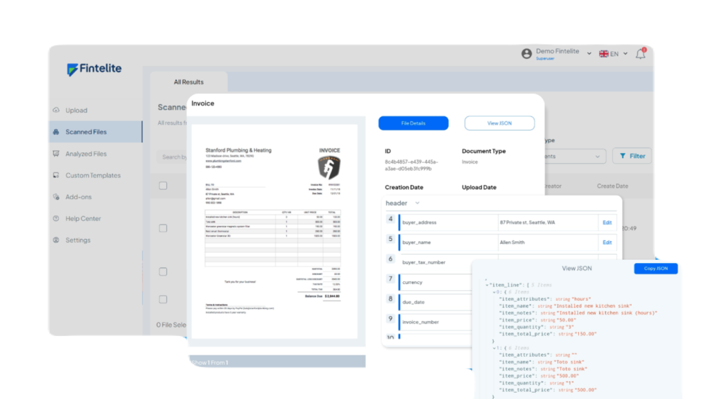If you’re looking to automate data extraction in a more efficient and straightforward way, Fintelite is a strong option to consider. Fintelite is designed to be easy to use, helping teams reduce manual work without dealing with overly complex configurations. The platform focuses on delivering a smooth experience from the start by offering ready-to-use models that can extract structured data from various industry-specific documents such as invoices, purchase orders, receipts, and financial statements.