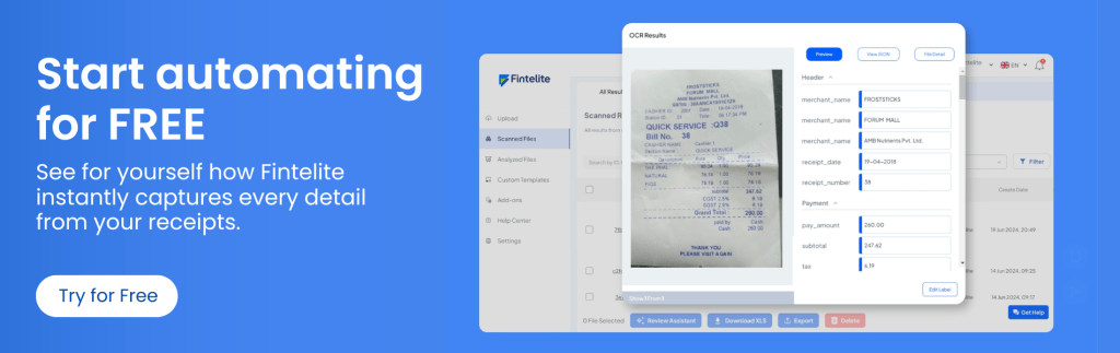 As mentioned in the previous answer, OCR captures every key piece of information from receipts, including when the receipt was made, the description of the purchase, and the payment details. If you use Fintelite AI-powered OCR, you even have the full control to customize which information to extract based on your specific processing needs.