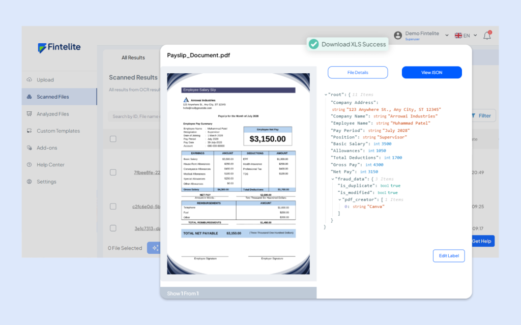 Fintelite AI OCR instantly recognizes and structures key data from the payslip, such as employee details, salary components, deductions, and net pay, in just seconds.
