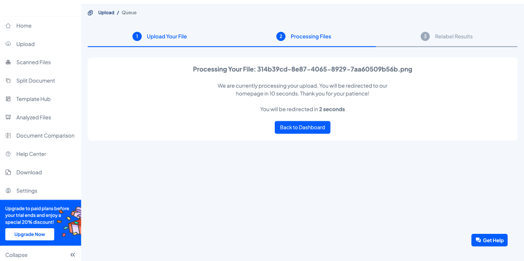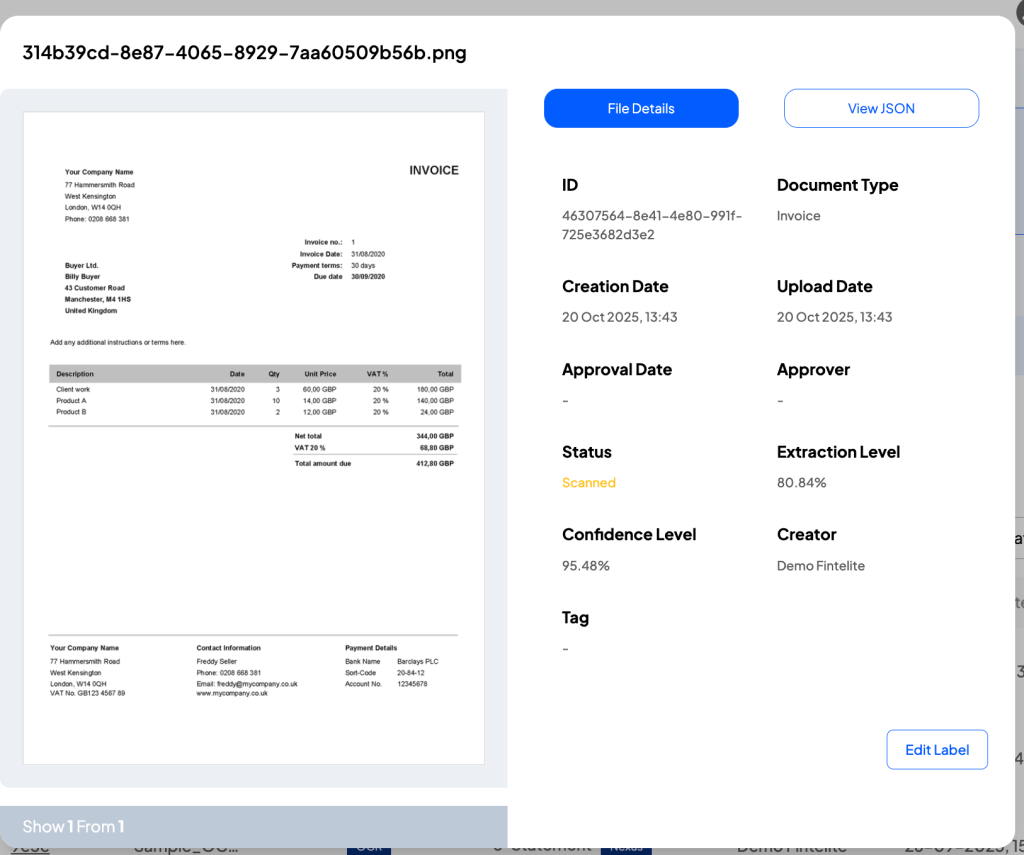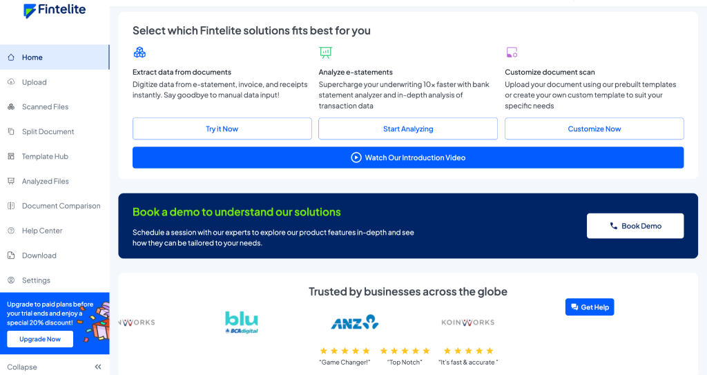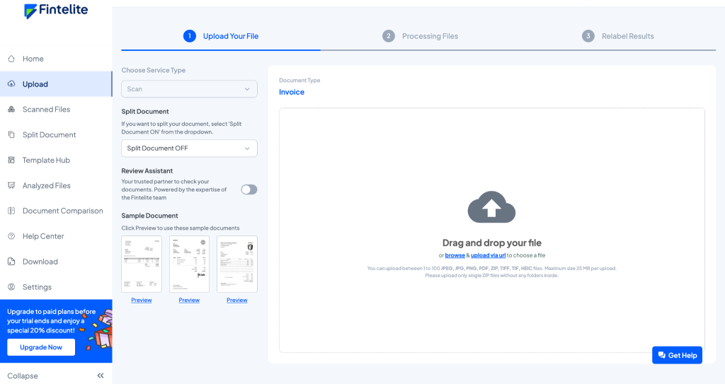 3. Upload your document to the Fintelite dashboard. You can also use the sample document provided on the dashboard. Once ready, click “Upload” to start the process.