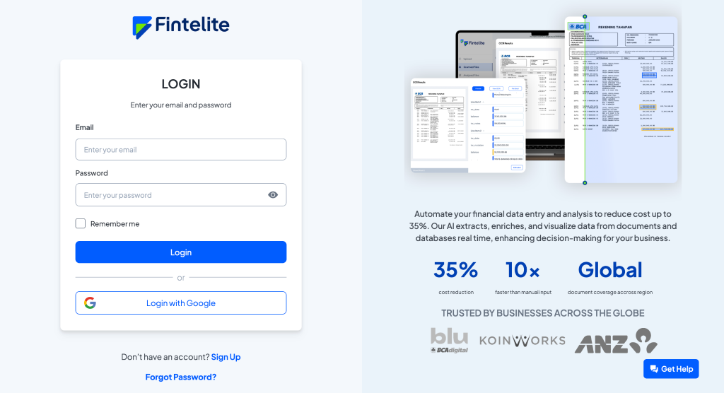 1. Log in to the Fintelite dashboard using your email and password. If you do not yet have access, you can request a free trial, and our team will provide it based on your business needs.