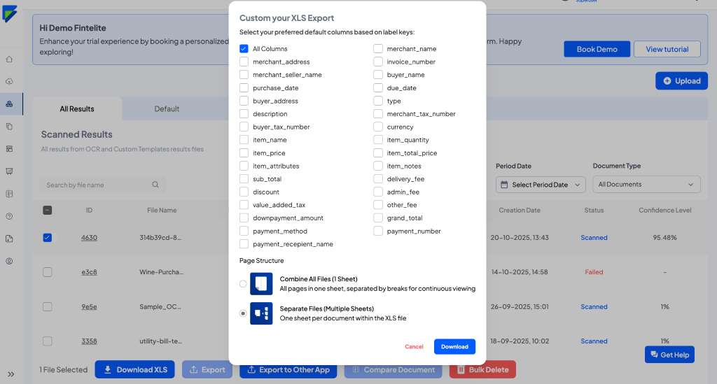 7. If you are satisfied with the extracted data, select your document and click “Download XLS.” Choose the key fields you want to include in your Excel file.