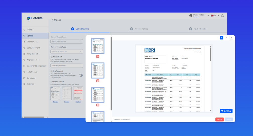 Fintelite automatically scans and extracts all the information contained in bank statements, from account holder details to transaction history, and converts it into clean, structured datasets within minutes.