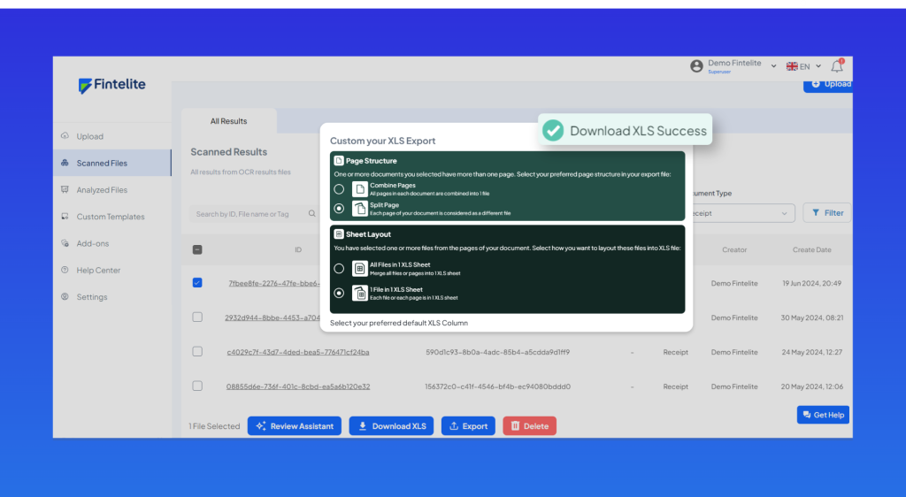 If you are looking for automation to process bank statements on a large scale in your business, Fintelite is the right solution. Fintelite’s intelligent OCR is built for maximum efficiency and greater accuracy. Powered by AI, Fintelite adapts to any bank statement format, making it seamless to use. Upload, process, and download, that is all it takes to convert your PDF bank statements into an XLS file.