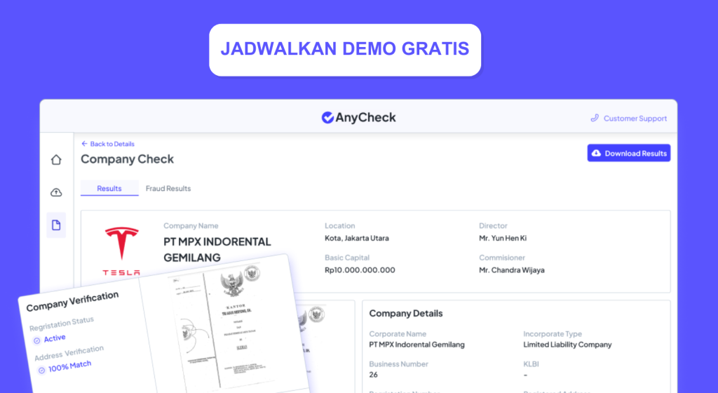 Saat ini, informasi lengkap mengenai AnyCheck dapat diakses melalui situs resmi anycheck.ai. Jadwalkan demo gratis sekarang untuk merasakan kemudahan verifikasi dan analisis risiko pinjaman bersama AnyCheck.