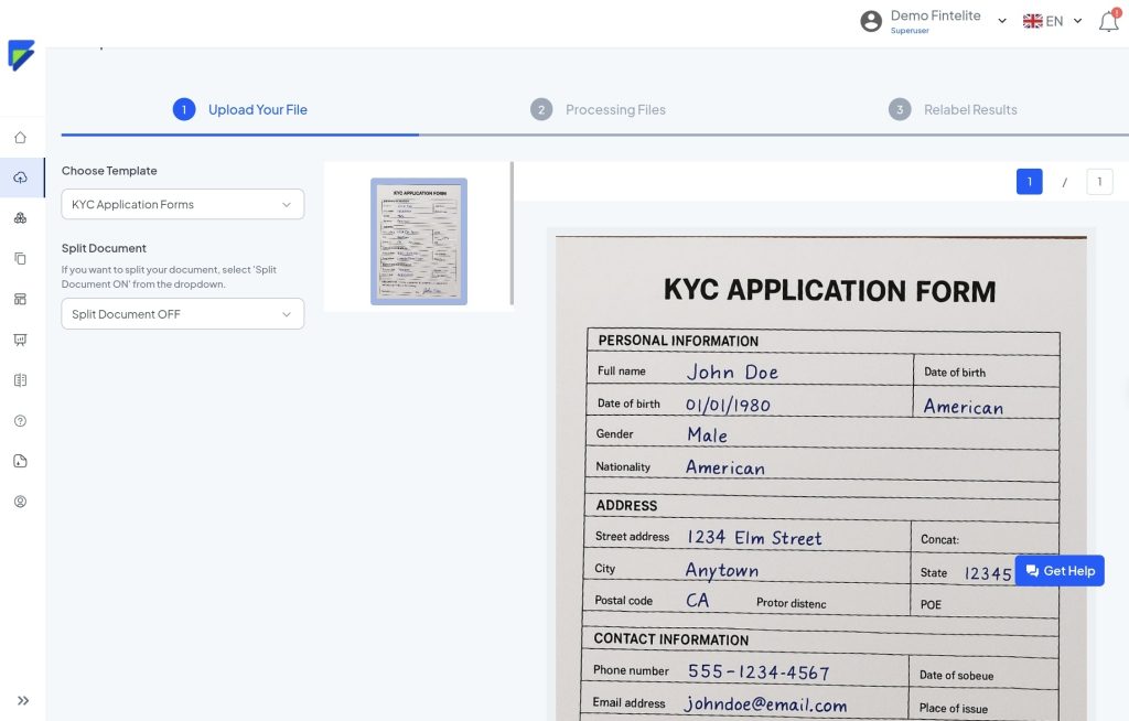 Fintelite has been empowering companies to transform their document workflows for years, delivering OCR solutions that make document processing way more efficient. With its high level of accuracy, Fintelite ensures reliable data extraction from customer forms, minimizing KYC delays due to errors. Furthermore, it gives you full control to determine what specific data to extract and how you want it organized, aligning your company standard. At Fintelite, data privacy is a top priority, we ensure all customer information is securely handled throughout the process.
