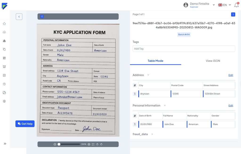 Fintelite’s intelligent OCR technology accurately extracts every detail in the document, such as names, contact information, address, ID numbers, and service preferences.
