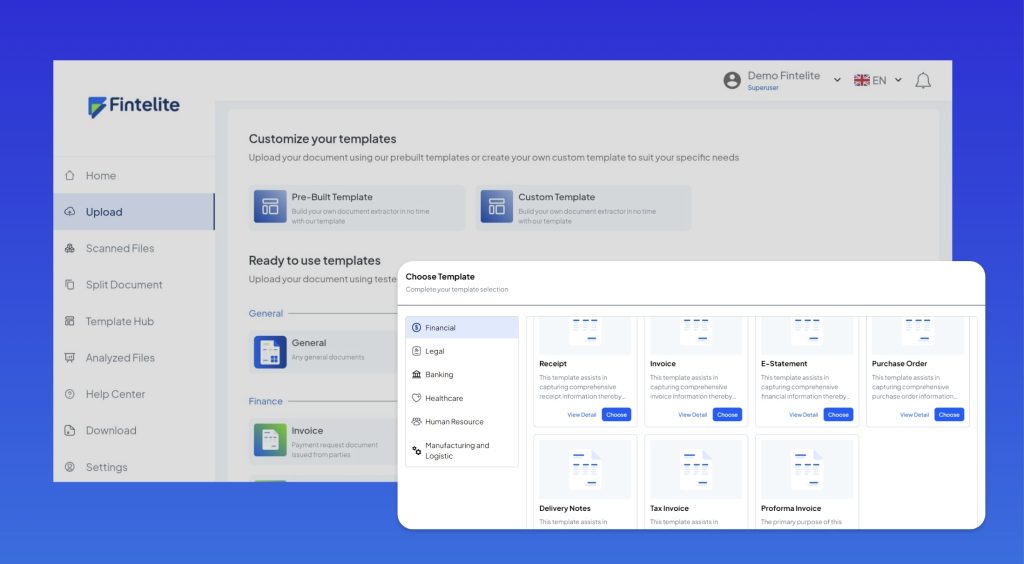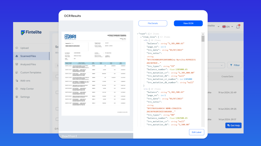 In this guide, we will use Fintelite AI OCR that offers fast processes and automated data extraction. Let’s see how Fintelite can make PDF to JSON simpler and easier.