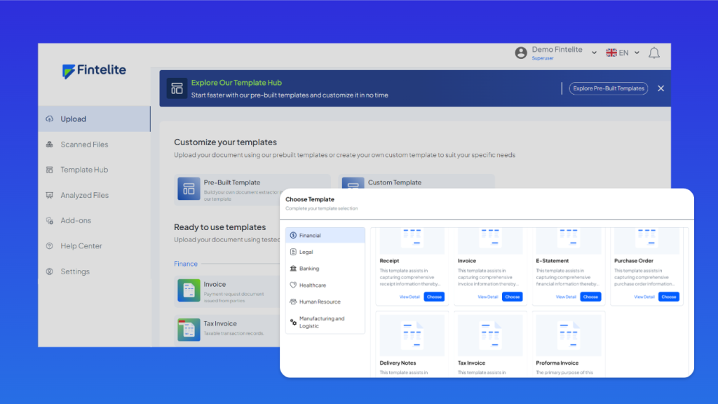 Choose what documents you want to process, or try customizing with our pre-built templates if the document type you’re looking for is not among the available options.