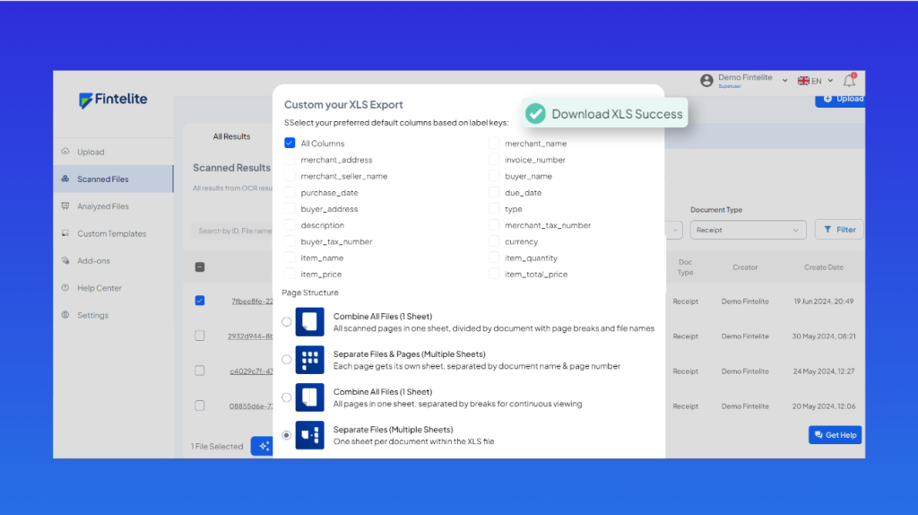 OCR by Fintelite is now advanced with a higher accuracy level, allowing you to automate data entry worry-free. Just upload your PDF, process, and export the extracted numbers in an XLS file seamlessly. We let you customize the XLS result to fit your existing Excel database.