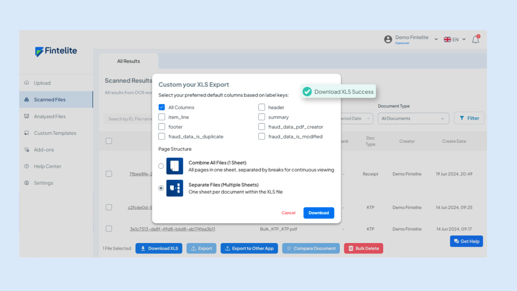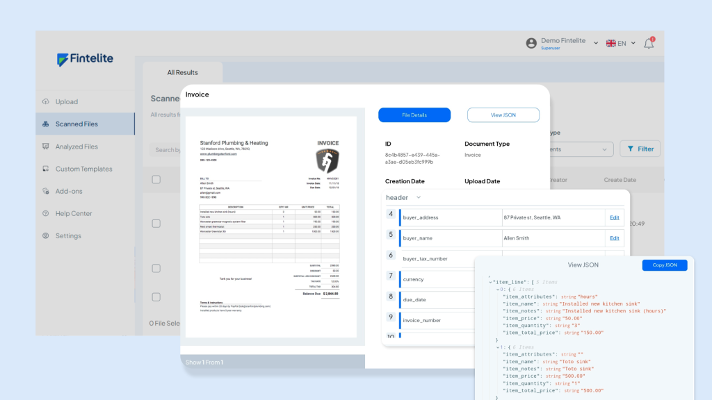 Once uploaded, Fintelite AI gets to work. The system automatically recognizes flat fields and line items. You have the flexibility to extract the full document or customize the output to focus solely on line items, depending on your needs.